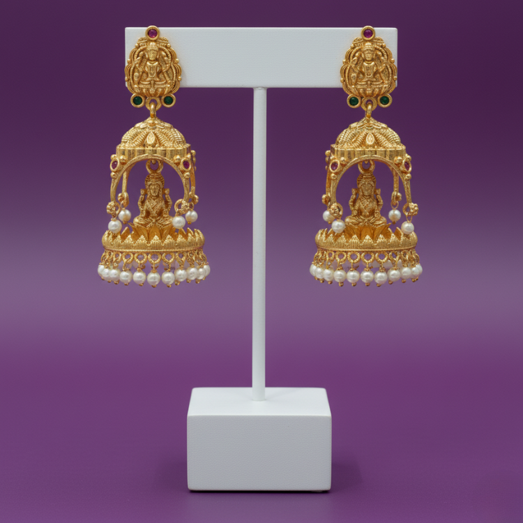 Exquisite temple jhumka earrings featuring a detailed Goddess Lakshmi design. Available with your choice of elegant pearl or vibrant green bead hangings. Perfect for bridal and festive wear.