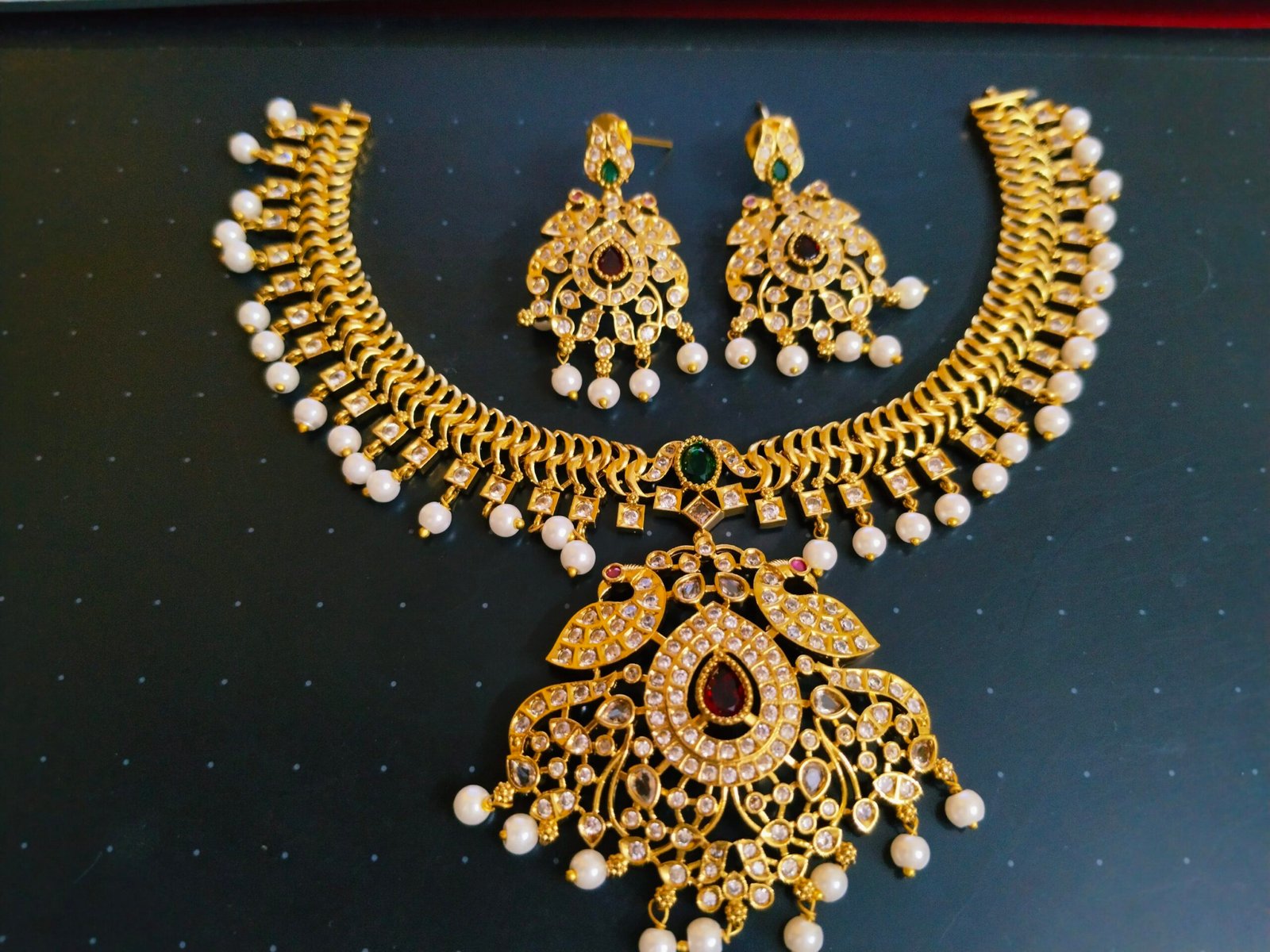This elegant gold-plated bridal jewelry set features a beautifully crafted necklace and matching earrings, showcasing an intricate peacock-inspired design adorned with sparkling white stones and delicate pearl drops. The necklace’s broad choker-style band is complemented by a large central pendant, enhancing the richness of the overall look. Perfect for weddings, festive occasions, and cultural celebrations, this timeless set adds a regal charm to any traditional attire.