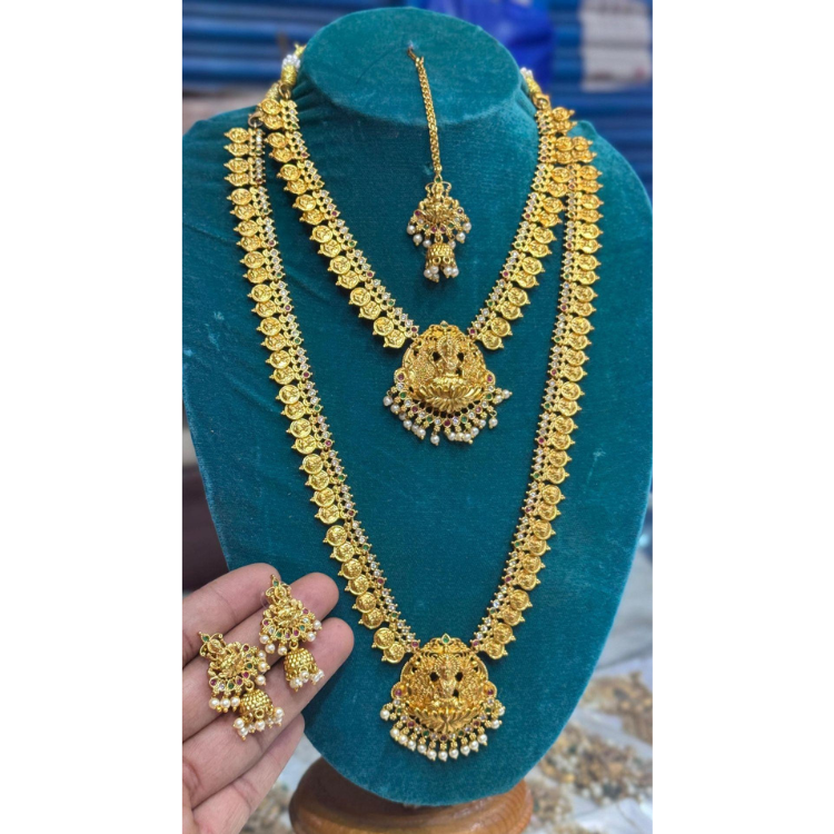 Elevate your festive and bridal look with this exquisite Lakshmi Coin Long Haram Set. Designed in classic temple jewellery style, this set features: